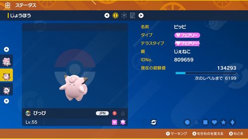 本日紹介するのはこちらのピッピ。 剣盾の頃に育成したダブル用の個体ですね。「このゆび」で味方を守ります。 で、このピッピなのですが…。 ピッピに似合うと思う二つ名の一つ、トゥインクルスターをつけております。 月のイメージがありますが、同じ夜の天…